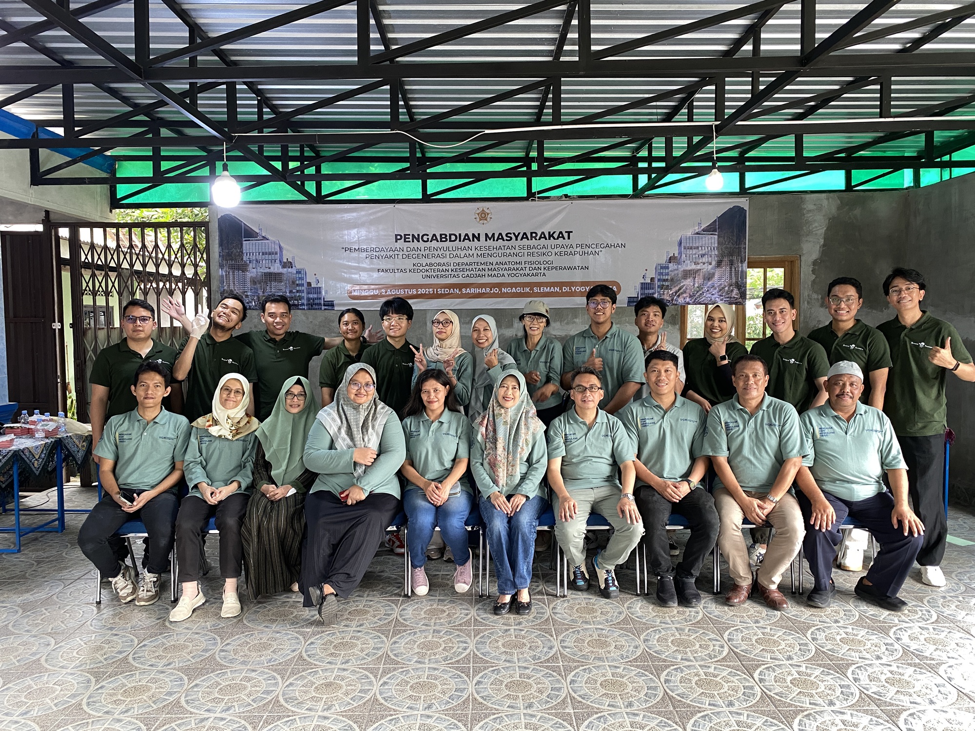 FK-KMK UGM. Departemen Anatomi Fakultas Kedokteran, Kesehatan Masyarakat, dan Keperawatan (FK-KMK) Universitas Gadjah Mada menyelenggarakan kegiatan pengabdian kepada masyarakat di Dusun Sedan, Sariharjo, Kecamatan Ngaglik, Kabupaten Sleman, pada Minggu (3/8/2025). Acara ini mengusung tema “Pemberdayaan dan Penyuluhan Kesehatan sebagai Upaya Pencegahan Penyakit Degeneratif dalam Mengurangi Risiko Kerapuhan”. Tujuan kegiatan adalah memberikan edukasi kesehatan sekaligus melakukan skrining dini terhadap masyarakat, dengan fokus utama pada pencegahan penyakit degeneratif yang berpotensi menimbulkan kerapuhan fisik.