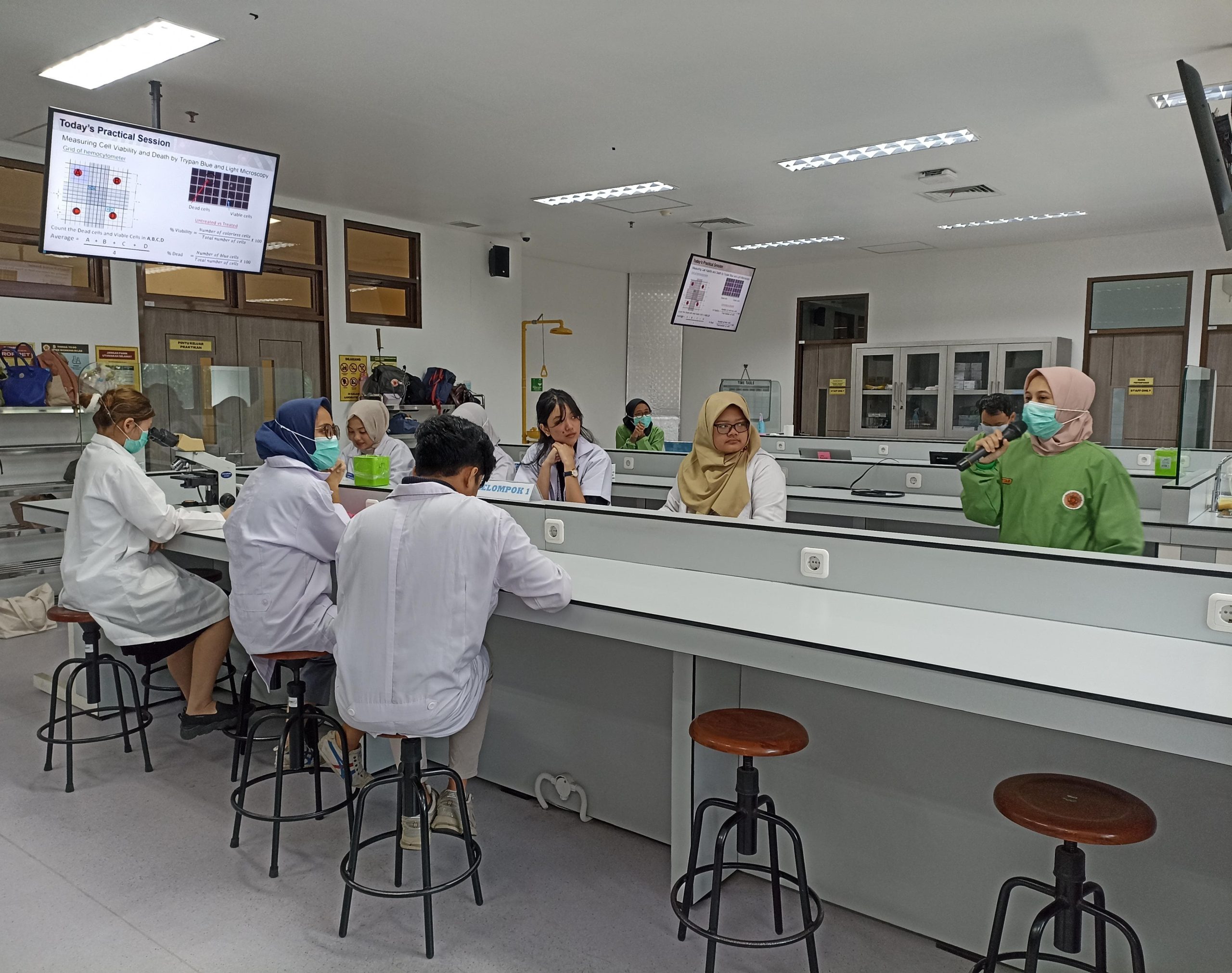 Dalam sesi pembelajaran tersebut, Departemen Farmakologi dan Terapi menghadirkan topik in vitro cancer pharmacology melalui praktik laboratorium yang dirancang untuk memberikan pemahaman mendalam tentang mekanisme kerja obat kanker. Peserta diajak mengeksplorasi efektivitas cisplatin, salah satu agen kemoterapi penting, dengan menggunakan kultur sel kanker HeLa. Melalui eksperimen ini, peserta dapat menyaksikan secara langsung bagaimana cisplatin menginduksi proses apoptosis pada sel kanker, serta memahami implikasinya dalam pengembangan terapi klinis.