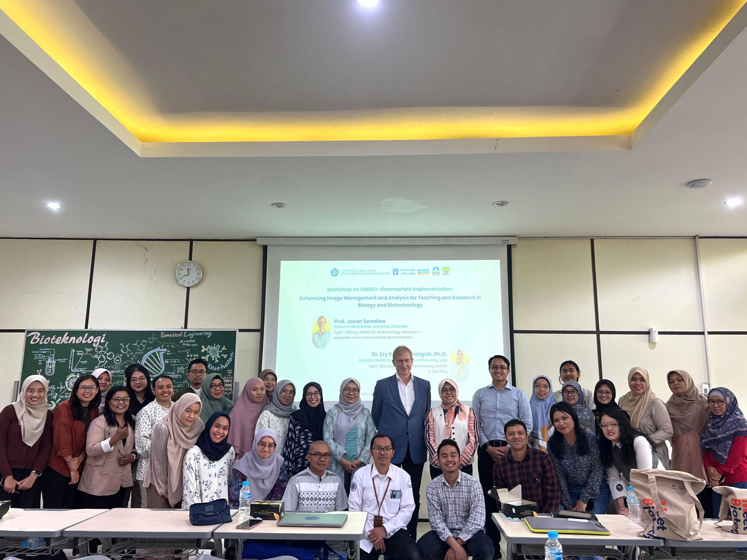 FK-KMK UGM. Departemen Patologi Anatomik, Fakultas Kedokteran, Kesehatan Masyarakat, dan Keperawatan Universitas Gadjah Mada (FK-KMK UGM) berperan aktif dalam penyelenggaraan Workshop on OMERO–GamaPath Implementation yang berlangsung pada Senin, 14 Juli 2025 di Lecture Room lantai 3, Gedung PAU UGM. Kegiatan ini digelar oleh Program Studi Bioteknologi UGM bekerja sama dengan University of Dundee, Skotlandia, dengan tujuan memperkuat pemanfaatan teknologi digital dalam pendidikan dan penelitian bioteknologi.