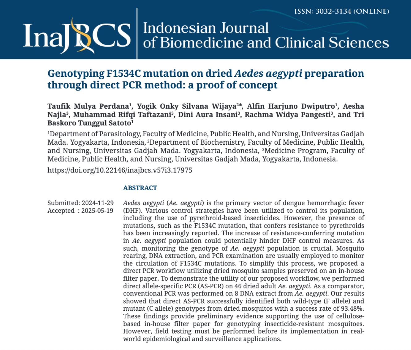 FK-KMK UGM. Fakultas Kedokteran, Kesehatan Masyarakat, dan Keperawatan (FK-KMK) Universitas Gadjah Mada mempublikasikan penelitian terkait pemantauan resistansi nyamuk Aedes aegypti, vektor utama demam berdarah dengue (DBD). Penelitian ini dipublikasikan pada tahun 2025 dalam Indonesian Journal of Biomedicine and Clinical Sciences Volume 57 Nomor 3 dengan judul “Genotyping F1534C mutation on dried Aedes aegypti preparation through direct PCR method: a proof of concept.”