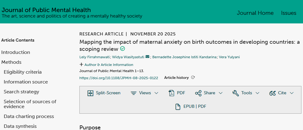 FK-KMK UGM. Dosen Fakultas Kedokteran, Kesehatan Masyarakat, dan Keperawatan Universitas Gadjah Mada (FK-KMK UGM) bersama mitra akademik Universitas Malahayati memuublikasikan penelitian mengenai kesehatan mental maternal. Artikel ilmiah berjudul “Mapping the impact of maternal anxiety on birth outcomes in developing countries: a scoping review” ini dipublikasikan pada 19 Oktober 2025 dalam jurnal internasional bereputasi Journal of Public Mental Health volume terbaru. Penelitian ini dilaksanakan oleh tim yang terdiri atas dr. Widya Wasityastuti (Departemen Fisiologi FK-KMK UGM), Lely Firrahmawati, Bernadette Josephine Istiti Kandarina, dan Vera Yulyani.