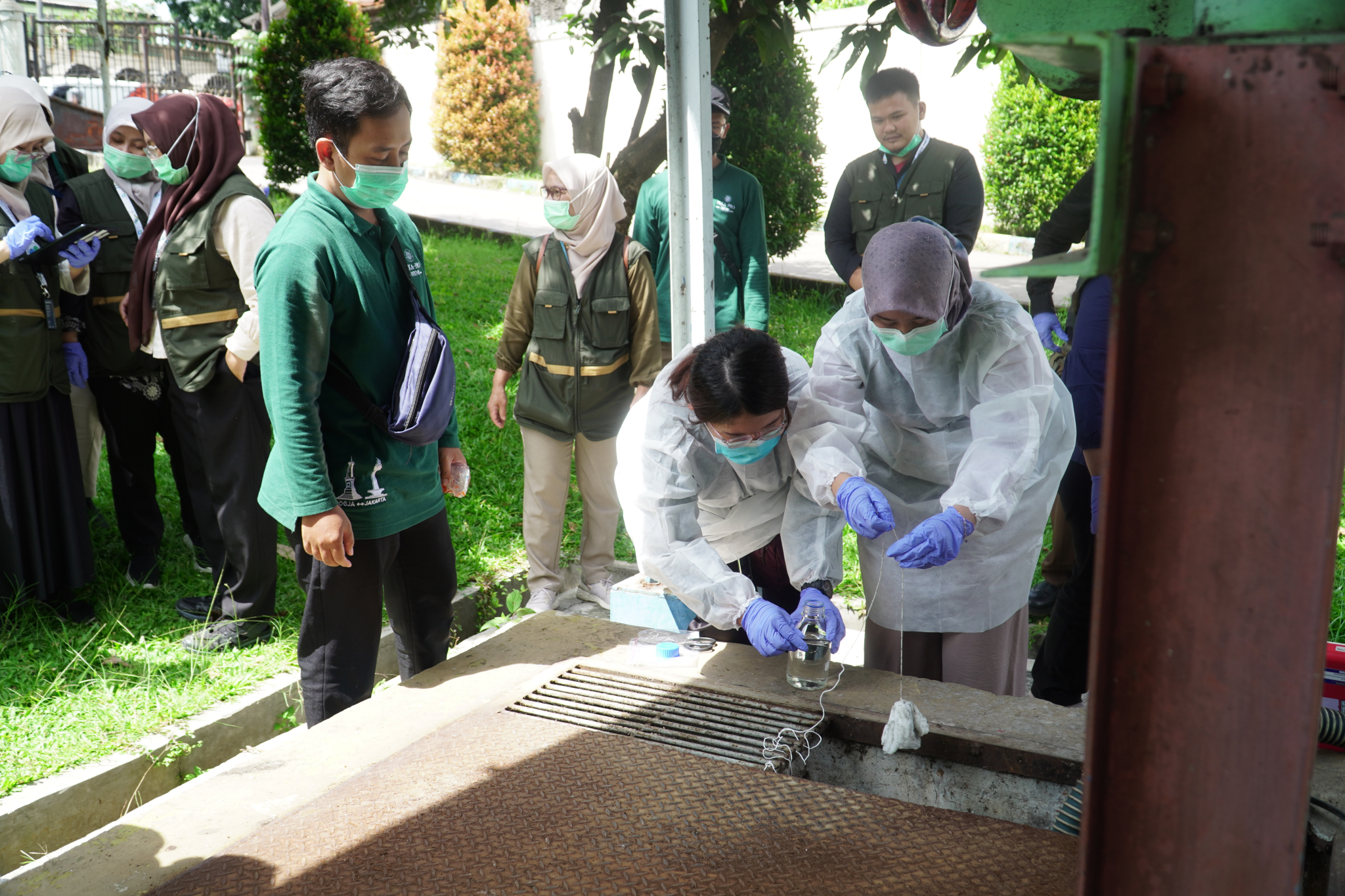 Hari kedua diisi dengan praktik lapangan di Stasiun Pompa Gumuruh, Stasiun Pompa Cijawura, dan Open Channel Bojongsoang. Peserta melakukan simulasi pemasangan Moore swab, grab sampling, pengukuran parameter fisik air, serta penginputan data melalui KoboCollect. Penyesuaian metode dilakukan sesuai karakteristik lokasi, termasuk penggunaan pemberat pada arus deras dan koordinasi keamanan alat dengan pengelola instalasi pengolahan air limbah.