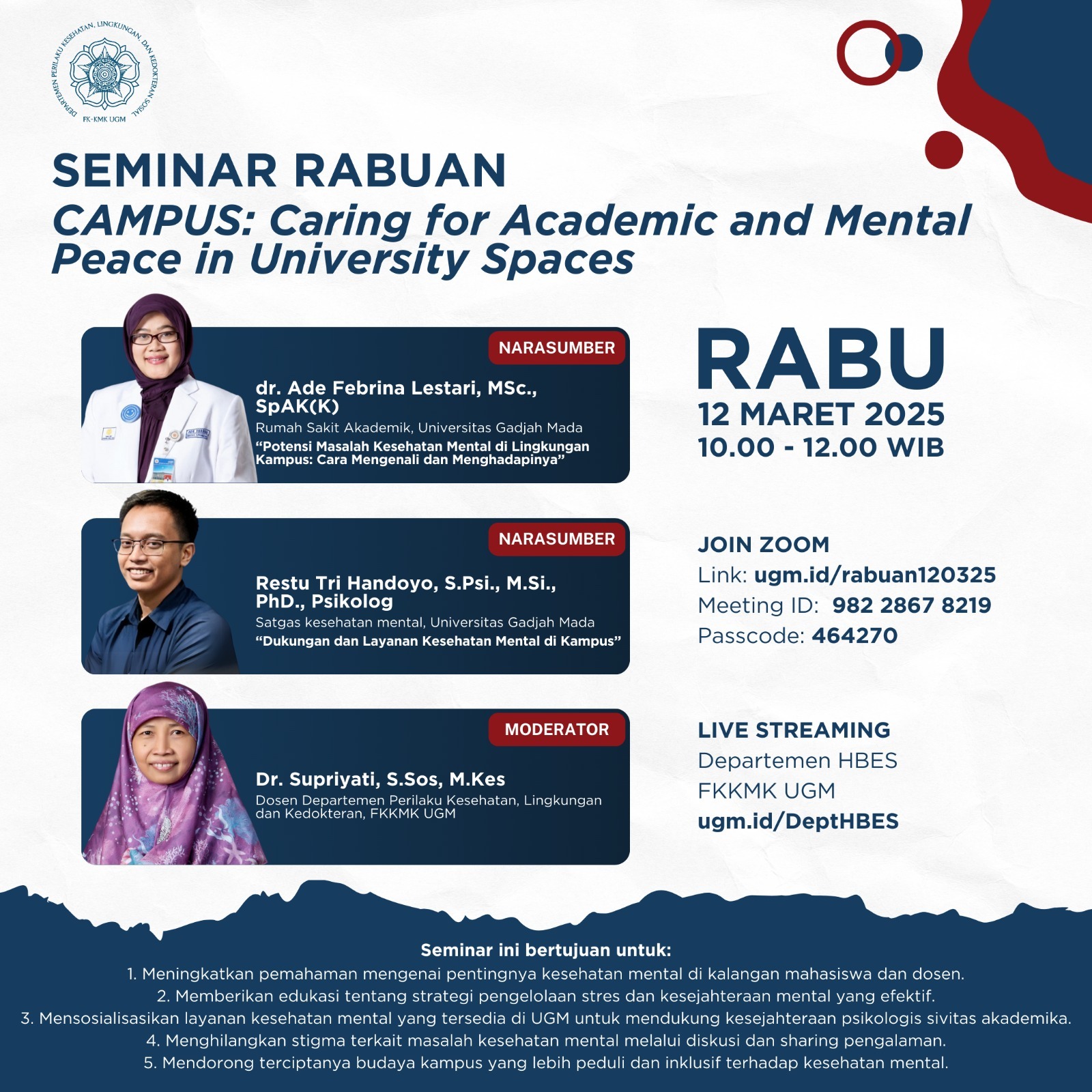 FK-KMK UGM. Departemen Perilaku Kesehatan, Lingkungan, dan Kedokteran Sosial, Fakultas Kedokteran, Kesehatan Masyarakat, dan Keperawatan (FK-KMK) Universitas Gadjah Mada bekerja sama dengan Kanal Pengetahuan FK-KMK UGM menyelenggarakan Seminar Rabuan bertajuk “CAMPUS: Caring for Academic and Mental Peace in University Spaces” pada Rabu 12 Maret 2025. Acara yang digelar secara daring ini bertujuan untuk meningkatkan kesadaran serta pemahaman tentang pentingnya kesehatan mental di lingkungan akademik. Kegiatan tersebut diikuti oleh mahasiswa, dosen, tenaga kependidikan, alumni, serta peneliti dan praktisi kesehatan masyarakat yang memiliki kepedulian terhadap isu kesehatan mental.