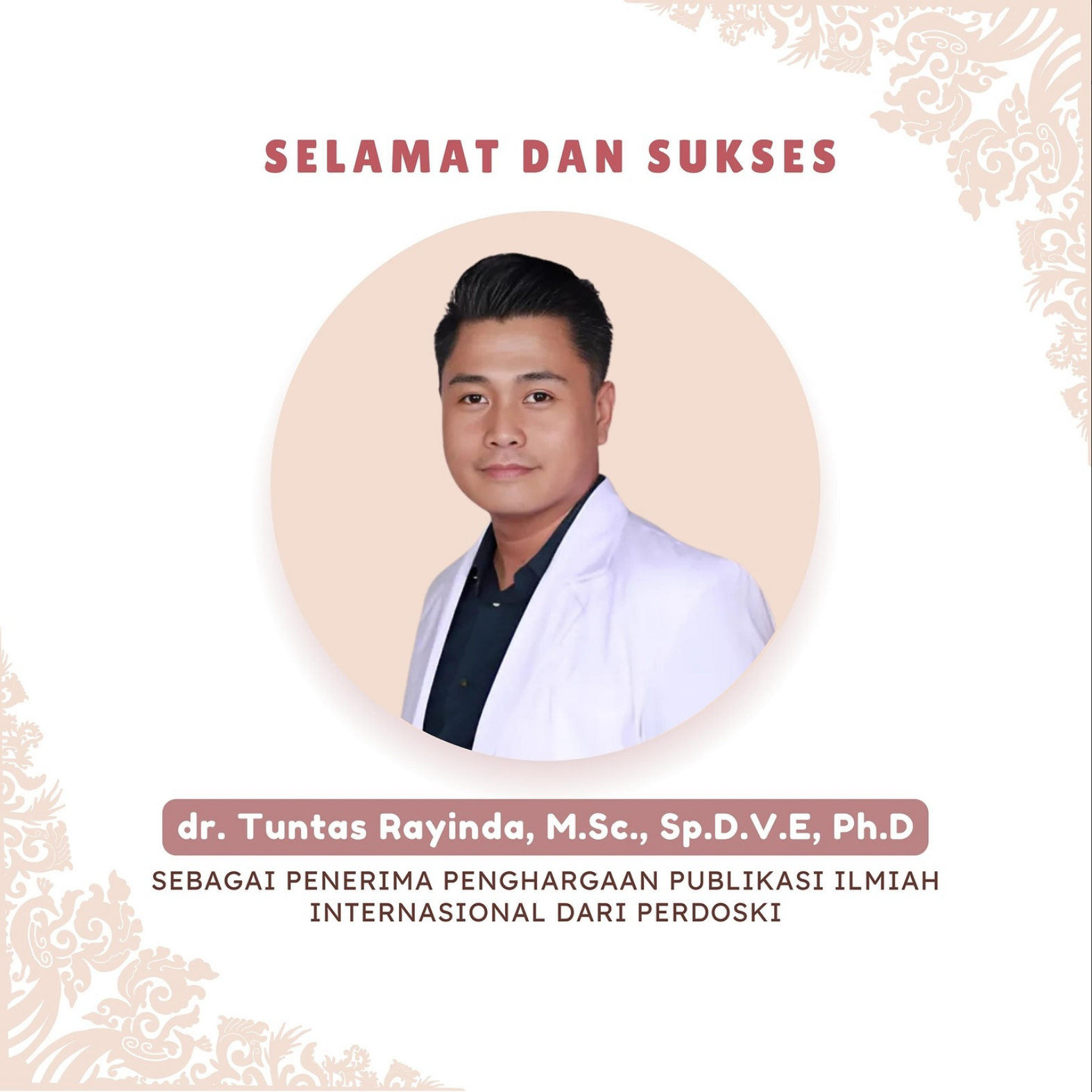 FK-KMK UGM. Fakultas Kedokteran, Kesehatan Masyarakat, dan Keperawatan (FK-KMK) Universitas Gadjah Mada (UGM) melalui Departemen Dermatologi dan Venereologi kembali menorehkan prestasi membanggakan. Pada hari Sabtu, 12 Juli 2025, Perhimpunan Dokter Spesialis Kulit dan Kelamin Indonesia (PERDOSKI) menyelenggarakan penganugerahan penghargaan publikasi ilmiah internasional sebagai bagian dari rangkaian Pertemuan Ilmiah Tahunan (PIT) XX PERDOSKI di Bali Nusa Dua Convention Center. Dalam kesempatan tersebut, dr. Tuntas Rayinda, M.Sc., Sp.D.V.E., Ph.D., staf Departemen Dermatologi dan Venereologi FK-KMK UGM, berhasil meraih penghargaan atas kontribusi akademiknya dalam publikasi ilmiah internasional.